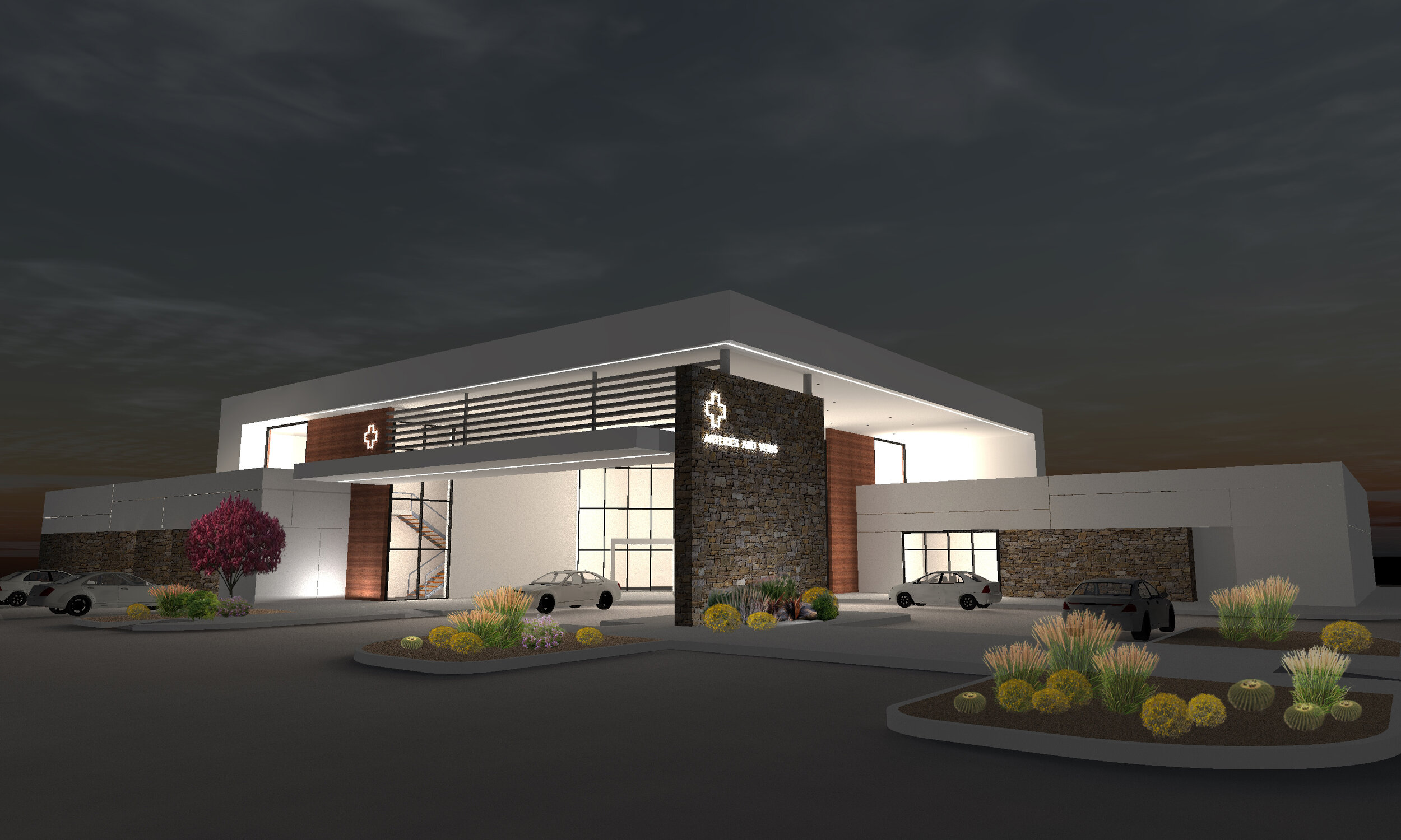 This facility's westerly orientation overlooks I-10 in West El Paso. The large canopy is designed to protect a large curtain wall from overheating and patients upon arrival.
